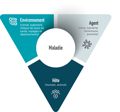 Le dernier composant du Triangle épidémiologique est l’environnement. Cela fait référence à tout facteur externe qui peut affecter l’exposition et la sensibilité. Les facteurs environnementaux peuvent comprendre des aspects physiques (p. ex. : le climat), les aspects biologiques (p. ex. : les animaux qui transmettent des agents), et des facteurs socioéconomiques (p. ex. : les rassemblements ou le manque d’hygiène).